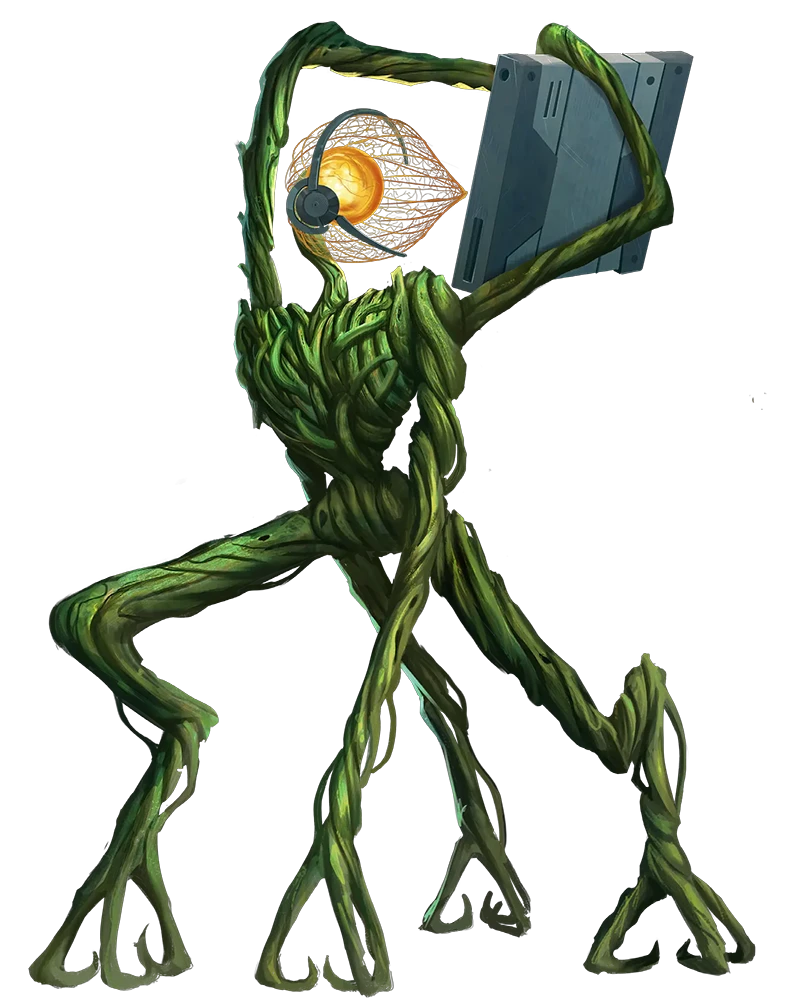 Once khizars settle into a favored body shape, they enter the sapling phase of life. The sapling grows their vines into strong, malleable limbs. Some saplings begin training their bodies into familiar shapes to put others at ease, growing two arms, two legs, a torso, and a large seedpod where a head would be, but many khizars prefer shapes that mimic the flora and fauna of the wilds where they first took root.