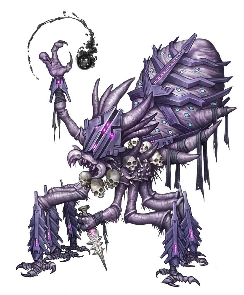 Jinsuls are a warlike species scattered across the Vast. Six-legged creatures with a bulbous body covered in eyes, jinsuls have notable segments of chitin along with a set of upper forelimbs for using equipment. They long ago lived in the region of space known as the Scoured Stars but eventually departed and settled on the harsh world of Rax. In recent years, the divine herald Dhurus unified the jinsuls into a cohesive force known as the Jinsul Hierocracy, which briefly retook the Scoured Stars. A joint alliance between several species and members of the Starfinder Society defeated Dhurus and scattered the jinsuls back into the Vast.