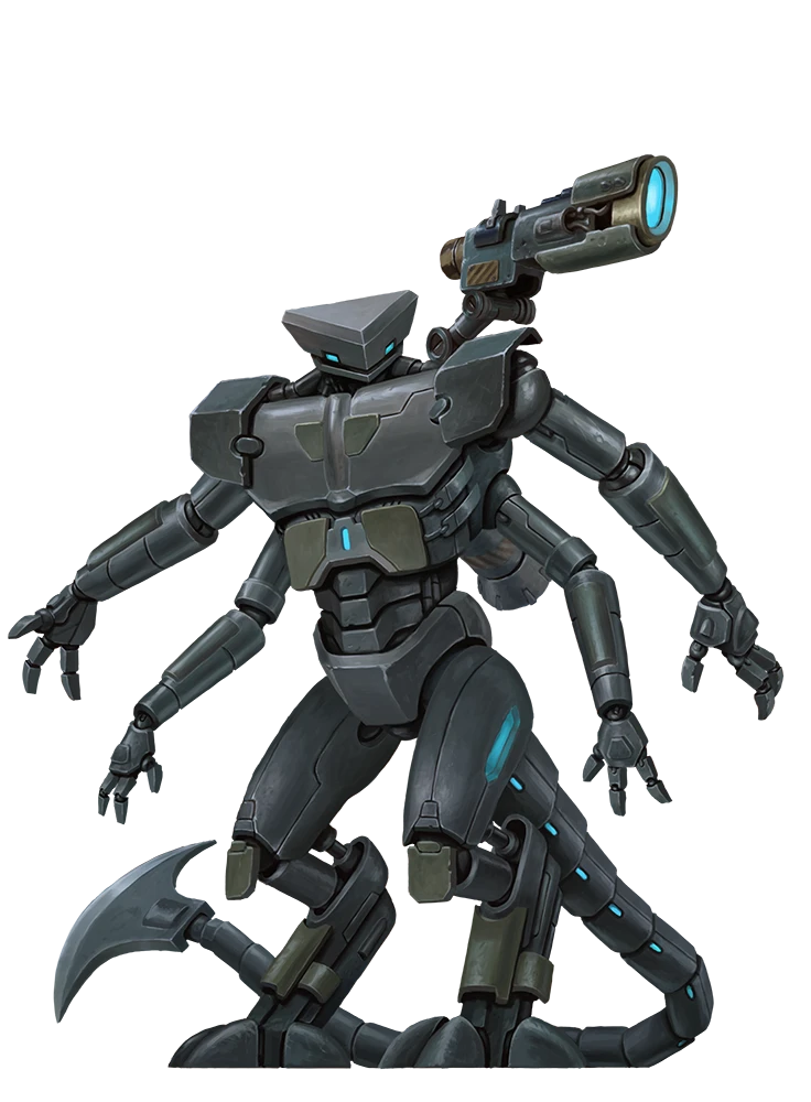Vanguard-class soldier robots are hulking machines of battle. They often have four clawed hands, digitigrade legs, a long tail, and a featureless, diamond-shaped head. Their back-mounted plasma launcher and burst-duration jump jets give them a hunched, predatory appearance, augmented by top-of-the-line weapons. Each is 8 feet tall and weighs 700 pounds.