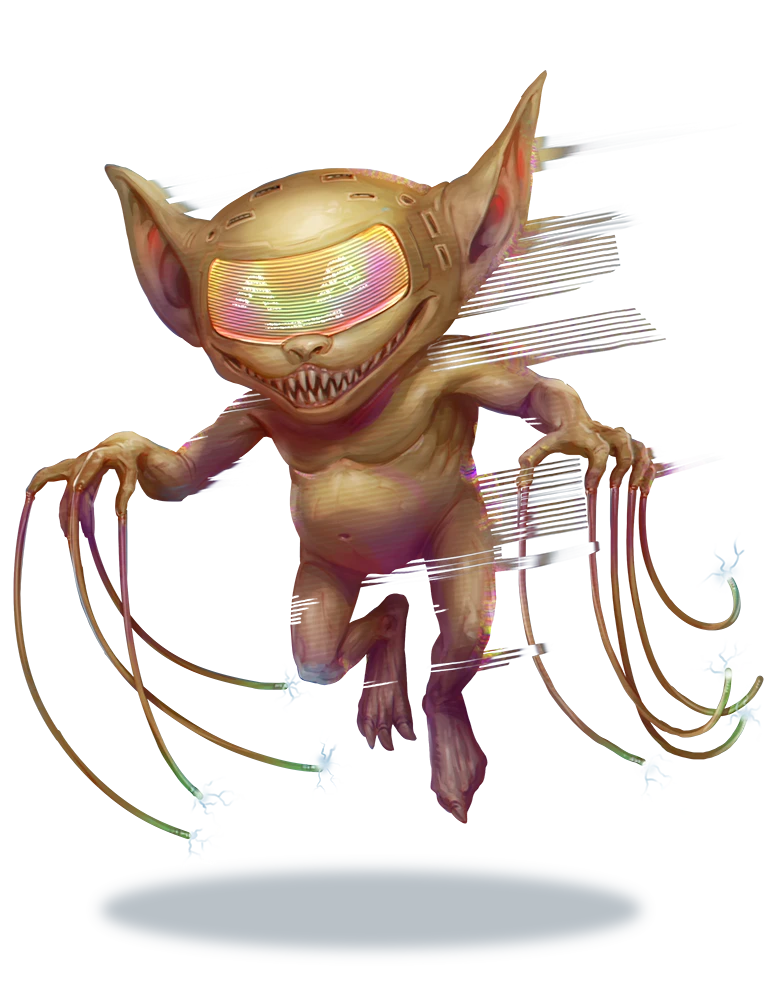 Many types of gremlins exist across the galaxy. Mech gremlins are an odd, solitary species who often take possession of incredibly powerful machines and wreak destruction on civilizations despite their own physical weaknesses. Infosphere gremlins are entirely digital beings who act more akin to hazards than creatures, but their presence can corrupt data across wide area networks and disrupt entire outposts with misinformation.