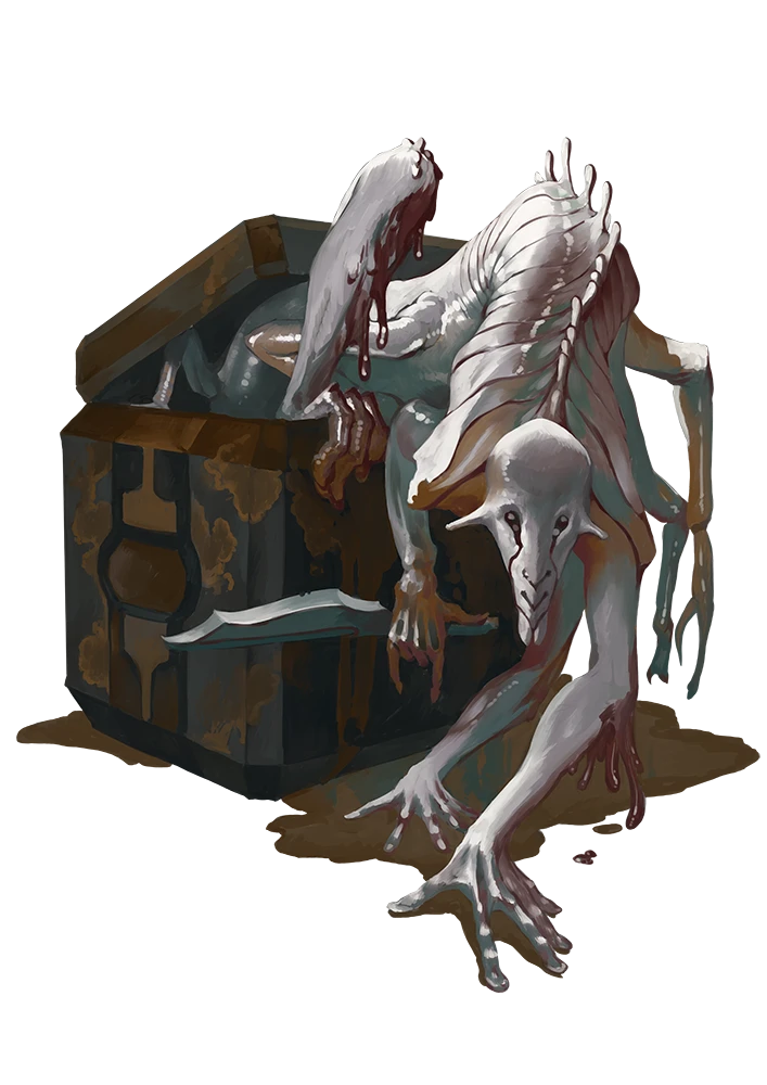 Alloids are interplanetary scavengers sent by the Dominion of the Black to plague the galaxy. These tall, thin, and spindly creatures appear to have metallic sheens to their smooth skin, often in copper or gold tones. An alloid's surprisingly pliable physiology allows them to mold their physical form to fit into tight spaces or stretch paper-thin against surfaces. It's rumored they can, with great effort, even mimic other people.