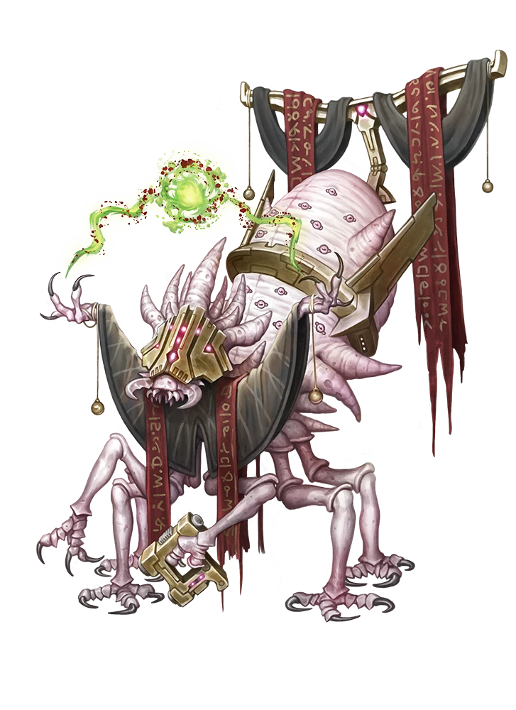 Jinsuls are a warlike species scattered across the Vast. Six-legged creatures with a bulbous body covered in eyes, jinsuls have notable segments of chitin along with a set of upper forelimbs for using equipment. They long ago lived in the region of space known as the Scoured Stars but eventually departed and settled on the harsh world of Rax. In recent years, the divine herald Dhurus unified the jinsuls into a cohesive force known as the Jinsul Hierocracy, which briefly retook the Scoured Stars. A joint alliance between several species and members of the Starfinder Society defeated Dhurus and scattered the jinsuls back into the Vast.