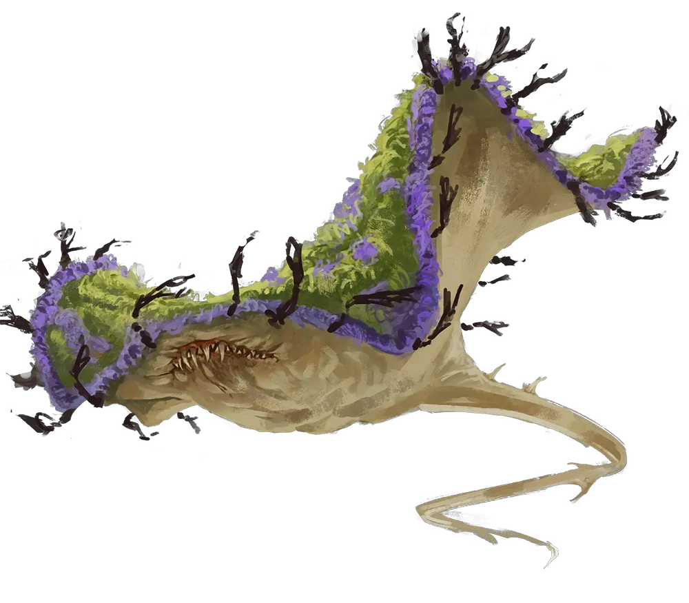 Always looking for an angle, the loyal camera crew followed up-and-coming producer Reculo (ambitious male elebrian producer) into the wilderness to document their experiences. Before the producer was swallowed whole, he managed to capture footage of a curious creature—large, flat, and shaped like a mound of dirt and moss with rows of razor-sharp teeth.
